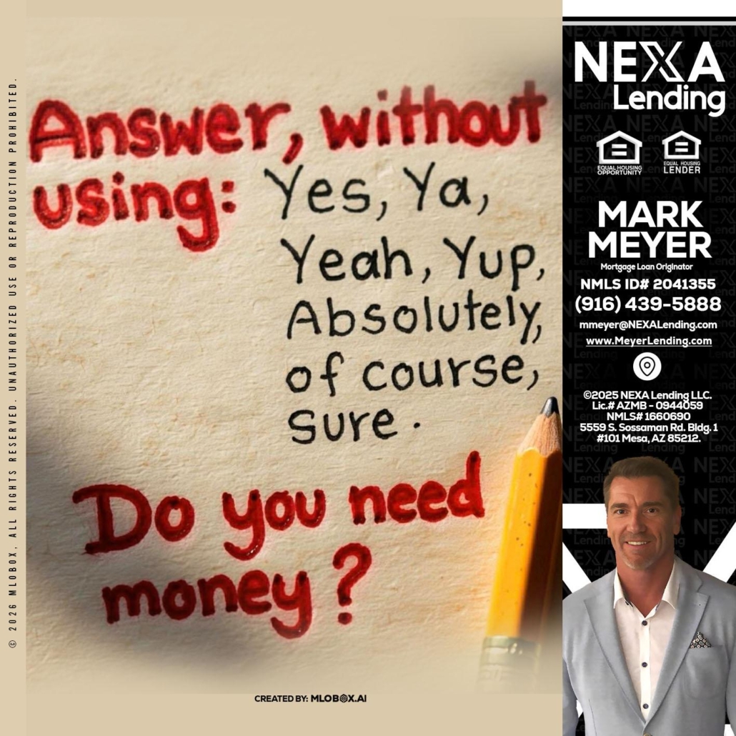 Hi, my name is Mark Meyer. I’m a Loan Officer with NEXA Lending LLC., offering personalized mortgage solutions, fast customized quotes, great rates and service with integrity.